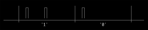 Рис.1a. FM-запись данных. Из-за такого недостатка, наибольшее количество битов в MFM записывается следующим образом: бит синхронизации записывается в начале битовой ячейки, если в предыдущей и текущей ячейке не записаны биты (См. рис. 1b). Такое кодирование делает разделение битов рядов более трудной задачей, но перемещает биты синхронизации близко к началу битовой ячейки.