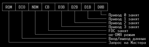 Главная последовательность выполнения команды 8272А состоит из следующих шагов: 0. Если DMA будет использоваться в операции, программируется канал 2 микросхемы 8237A для режима пересылки одиночного байта. (Примечание: сигнал счетчика терминала (TC) из DMA будет вызывать непосредственное завершение FDC-операций). 1. Для каждого байта в команде, ждите, пока бит RQM не станет = 1, затем проверьте DIO: значение 0 указывает, что FDC готов принять команду, 1 означает, что ваша команда не распозналась FDC (последующее чтение из DR будет возвращать 80h) или что вы уже подали все данные в FDC (а также, что ваша команда недопустима). Если ваша команда не имеет фаз выполнения и кончания (например, Определить), вы останавливаетесь здесь. 2. Если вы запиустили FDC в режиме не-DMA и команда пересылает данные в течение фазы выполнения (чтение, запись, форматирование), вы ждете, пока бит NDM равен нулю. Когда NDM станет = 1, для каждого читаемого или записываемого байта вы ждете установки бита RQM, и тогда записываете следующий байт в (или читаете его из) DR. Если вы не используете пересылку DMA-режима (или не пересылаете данные вообще), вы просто переходите к шагу 3. 3. Конец фазы выполнения указывается IRQ 6 (int 0eh). Вы можете или разрешить 8272A прерывание и обнаруживать его в вашей подпрограмме обработки, или можете постоянно опрашивать регистр запроса прерывания 8259A (IRR). Если команда не имеет фазы выполнения (Опросить состояние дисковода), вы переходите к шагу 4. 4. В фазе результата вы читаете состояние команды из FDC, тестируя бит RQM (убедитесь, что DIO = 1). 8272A может возвращать до трех байтов состояния (которые описываются ниже) наряду с другими данными, которые будут изменяться от команды к команде. Для команд чтения/записи/сравнения передаются следующие байты: