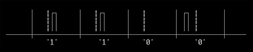 Рис.1b. MFM-запись данных. Легко увидеть, что значение и FM- и MFM-кодирования зависит от начальной позиции битовой ячейки. Например, если мы разместим биты, как показано подчеркнутыми штриховыми линиями на рис. 1b, последовательность 1100 станет 0010. Поэтому, для обеспения однозначного декодирования, каждое поле данных на дорожке сопровождается полем синхронизации.