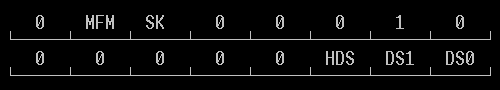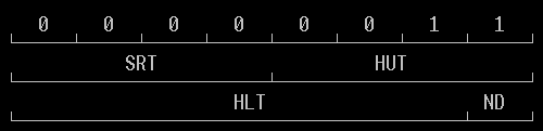 SRT - интервал скорости шага. Устанавливает минимальную задержку между двумя импульсами шага дисковода. (1-16 мс, SRT = 0Fh соответствует 1 мс). Более старые дисководы PC не выполняли 3- или 4-мс скорость шага, а некоторые не могут выполнить с 2- или даже 1-мс скорость шага. HUT - время разгрузки головки. Задержка между завершением операции чтения-записи и подъемом головки. (16-240 мс, HUT = 0 соответствует 16 мс). Оно обычно устанавливается в 240 мс. HLT - время загрузки головки. Задержка между командой загрузки головки и началом операции чтения-записи. (2-254 мс, HLT=1-2 ms). Обычно устанавливается в 2 мс. ND - 0: режим DMA. 1: не-DMA режим. Все таймеры внутри 8272A фактически синхронизируются по сигналу WR CLK, так что все значения, показанные здесь, правильны для WR CLK 500 КГц, или скорость пересылки данных составит 500 КБод. Понижение частоты WR CLK будет удлинять все внутренние счетчики задержек.